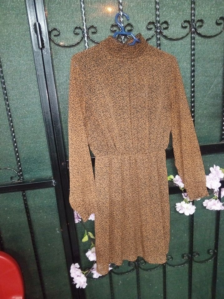 Uzun kahverengi triko elbise, bol kesim, yüksek yaka ve uzun kolludur. Koyu çiçek desenli, bohem ve rahat tarzda bir modeldir.