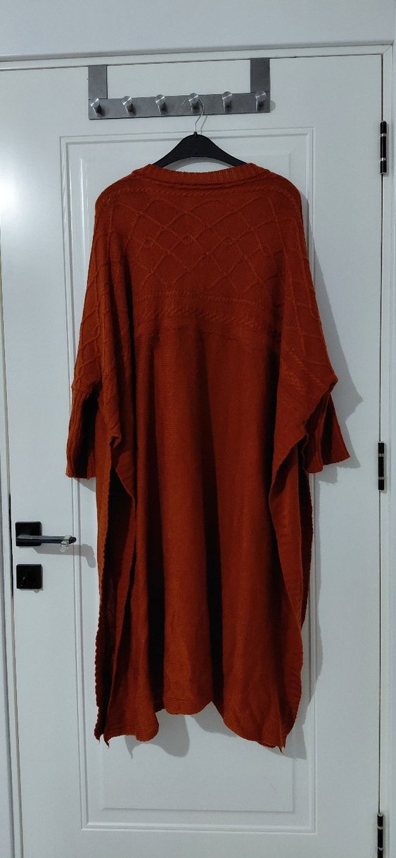 Uzun kahverengi triko elbise, bol kesim ve drapeli tasarıma sahiptir. Yuvarlak yaka ve uzun kolludur. Rahat, bohem tarzıyla günlük kullanıma uygundur.