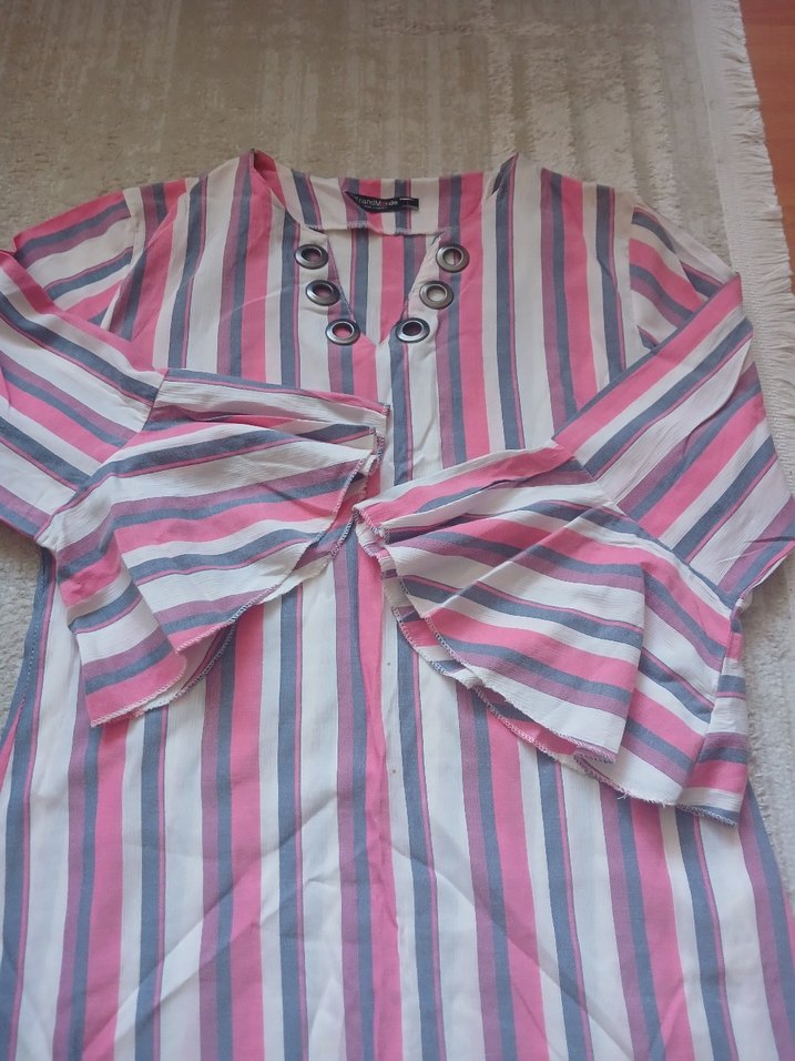 Düğmeli, tekne yaka ve bol kesim bluz. Sentetik kumaştan yapılmış, pastel pembe çizgili desenli, uzun kollu ve bohem tarzda.