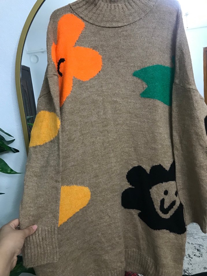 Kahverengi örme kazak, balıkçı yaka ve uzun kollu, bol kesimdir. Renkli çiçek desenleriyle bohem tarzda, günlük kullanıma uygundur.
