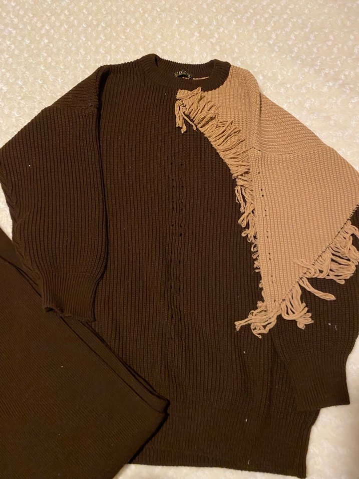 Bohem Tarz Uzun Kollu Kahverengi Örgü Kazak ve pantolon takım