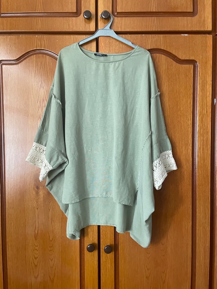 Krem rengi, uzun kollu ve drapeli manşetlere sahip bluz. Yumuşak keten kumaştan, gevşek ve midi boyda, bohem tarzda günlük kullanıma uygun. Manşetleri ben ekledim.
