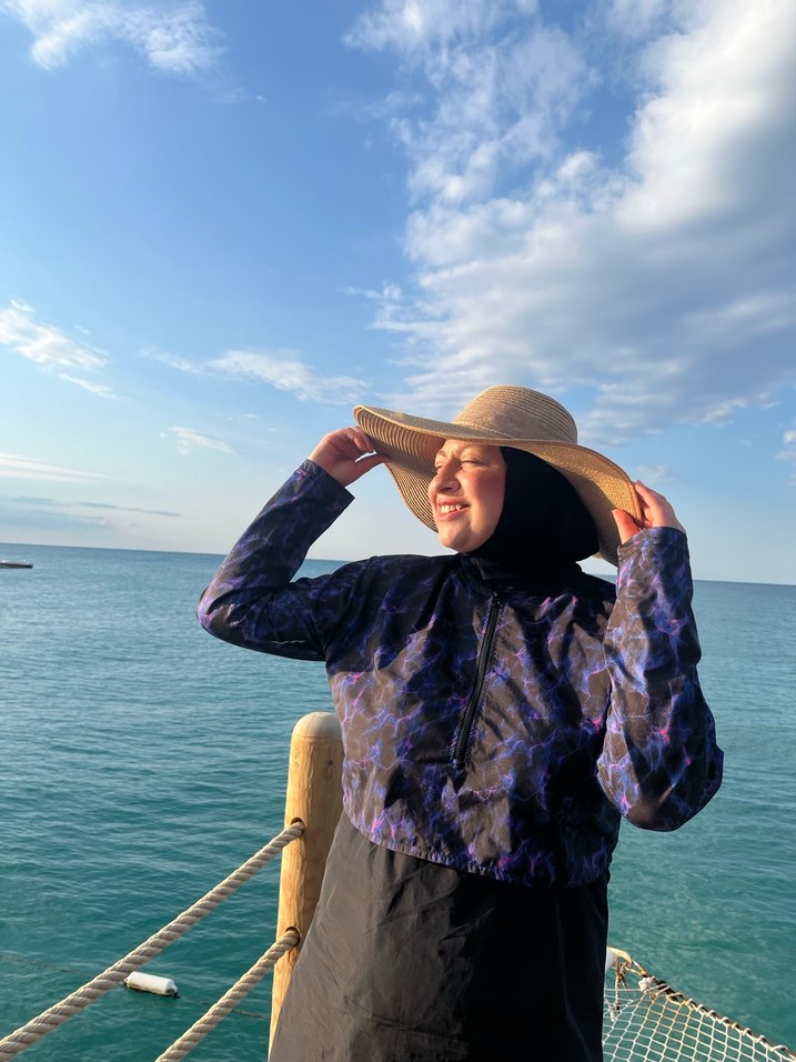 Bu bol kesim kadın mayosu, uzun kollu ve drapeli tasarımıyla koyu lacivert bağlamalı desen sunar, günlük kullanıma uygundur.