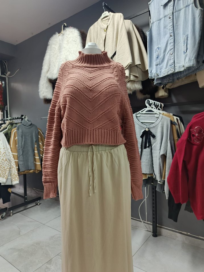 toz pembe renkli, yüksek yakalı ve uzun kollu örgü kazak, bol kesimiyle rahat ve bohem tarz sunar. Desensiz, günlük kullanıma uygundur.