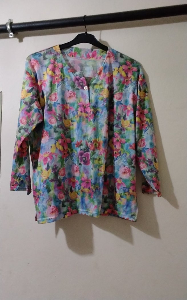 Yumuşak sentetik kumaştan, düğmeli ve V yaka uzun kollu, bol kesim gömlek. Pastel çok renkli çiçek desenli, günlük kullanıma uygun.