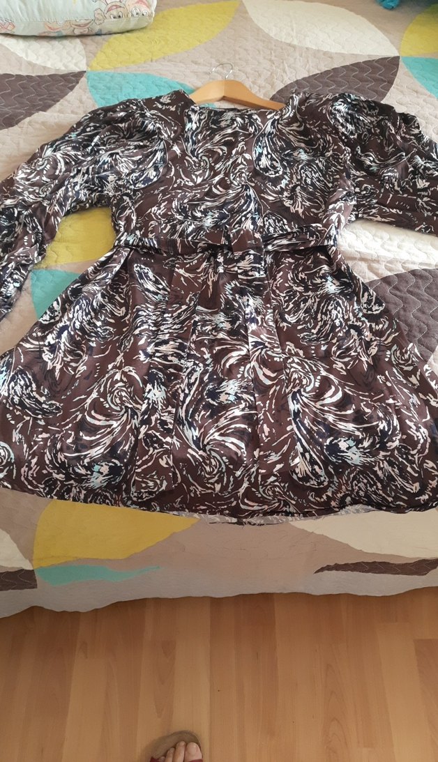 Bohem tarzda, uzun kollu, V yakalı, bol kesim desenli elbise . Koyu kahverengi batik desenli, drapeli ve günlük kullanıma uygun.
