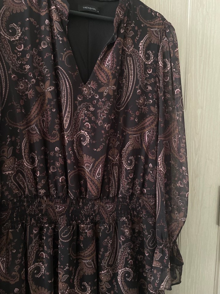 Kahverengi, bol kesim, desenli, drapeli ve V yakalı hamile bluzu. İpek dokulu kumaştan, uzun kollu ve uzun boylu, ofis için bohem tarzda uygun.