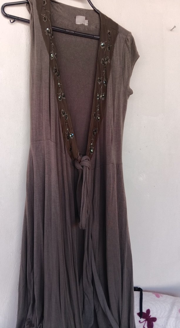 Bej keten kumaştan, bol kesim, uzun kolsuz, V yaka bohem tarz elbise. Dekoratif detaylarla süslenmiştir.