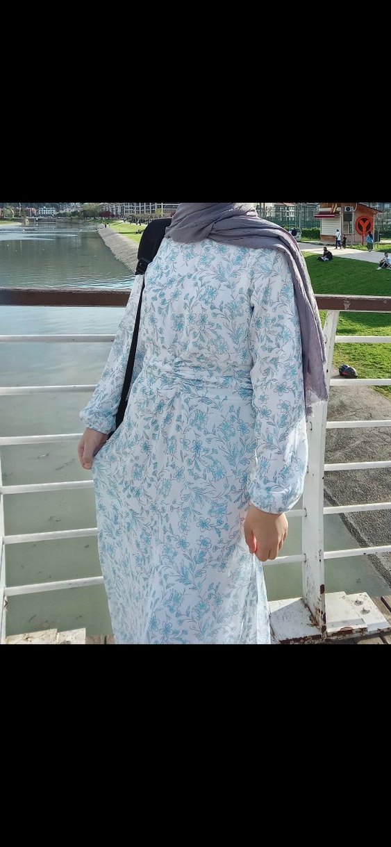 Yüksek yakalı, uzun kollu, bol kesim uzun elbise, yumuşak sentetik kumaştan pastel tonlarda batik desenlidir. Günlük kullanıma uygundur.