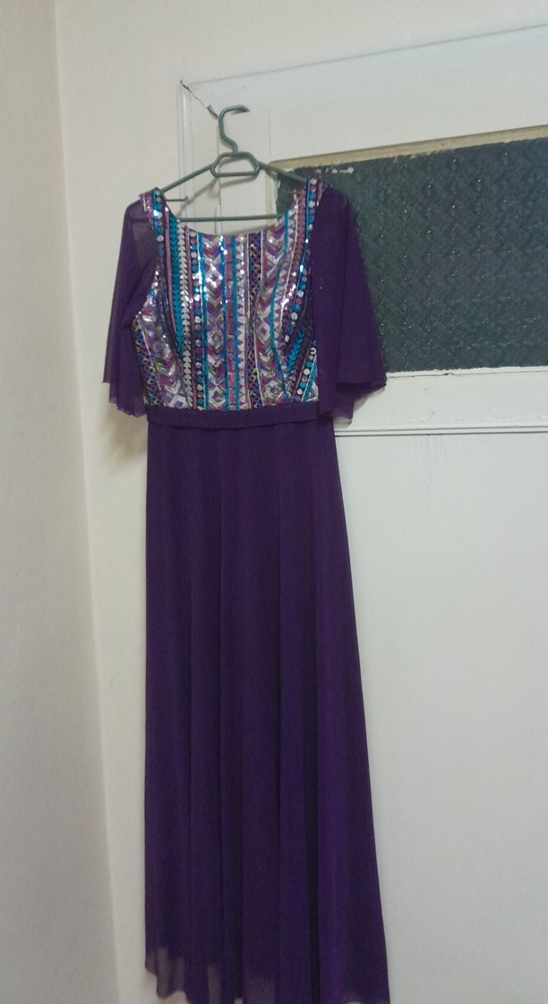 Drapeli, bol kesim uzun mor elbise, kısa kollu ve kayık yaka. Desenli üst kısmı ile düğün ve bohem tarzlar için uygun. 36 38 bedenler oluyor