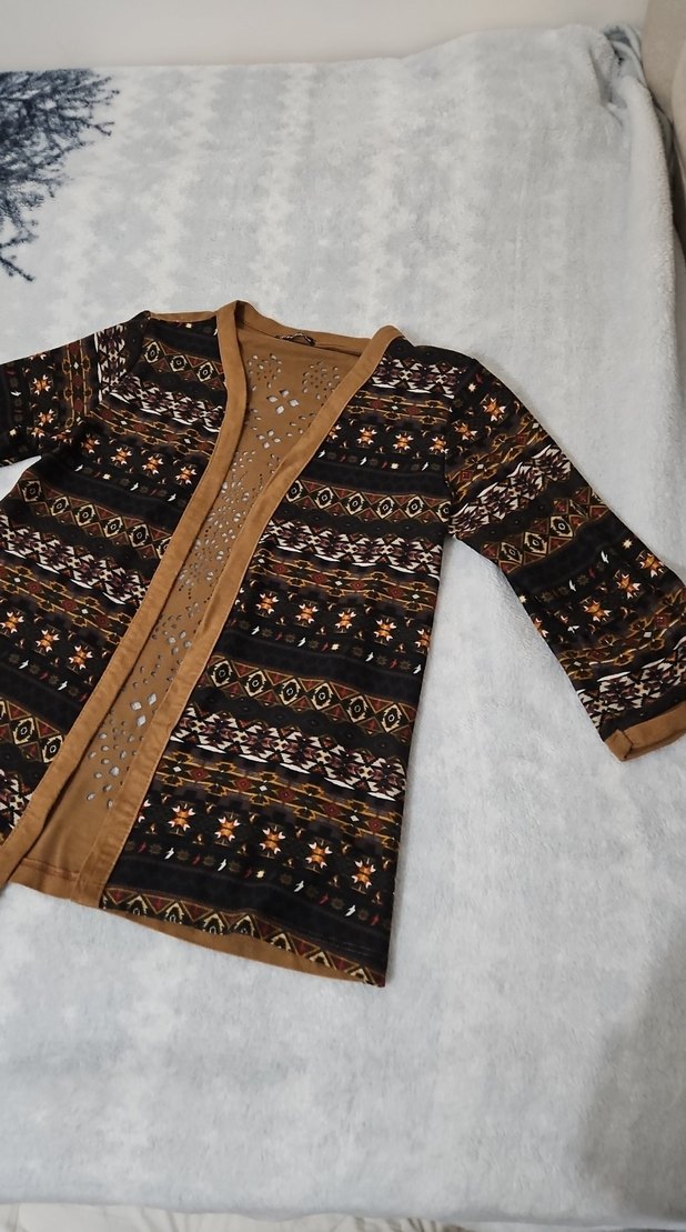Kadınlar için uzun örgü desenli, koyu kahverengi tekstil kimono. Uzun kollu, bol kesim ve V yakalı, bohem tarzda günlük kullanım için uygundur.