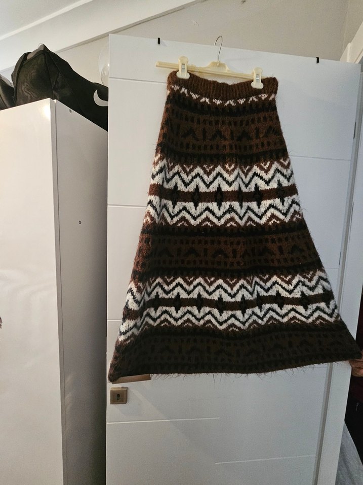 Uzun, bol kesim örgü etek, koyu kahverengi ve beyaz bohem desenli, rahat ve retro tarzda günlük kullanıma uygun. s-m beden uyumlu