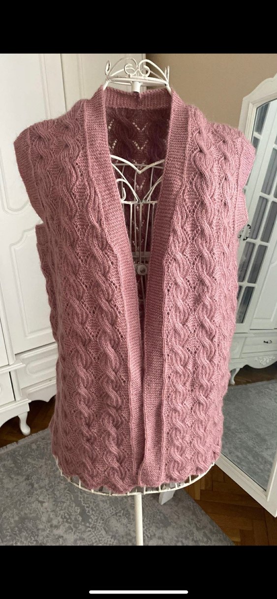 Uzun, kolsuz, bohem tarzda, boğazlı yaka ve bol kesim pembe örgü kadın yeleği. Günlük kullanıma uygundur.