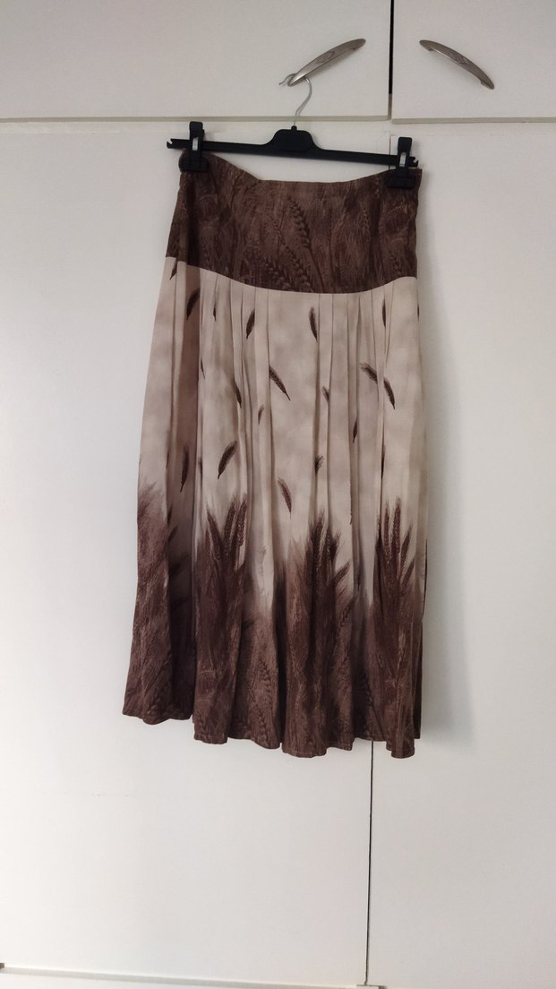 Bej ve gri bağlama desenli, pileli uzun etek. Sentetik kumaştan, bol kesim, bohem ve hippie tarzını yansıtır.