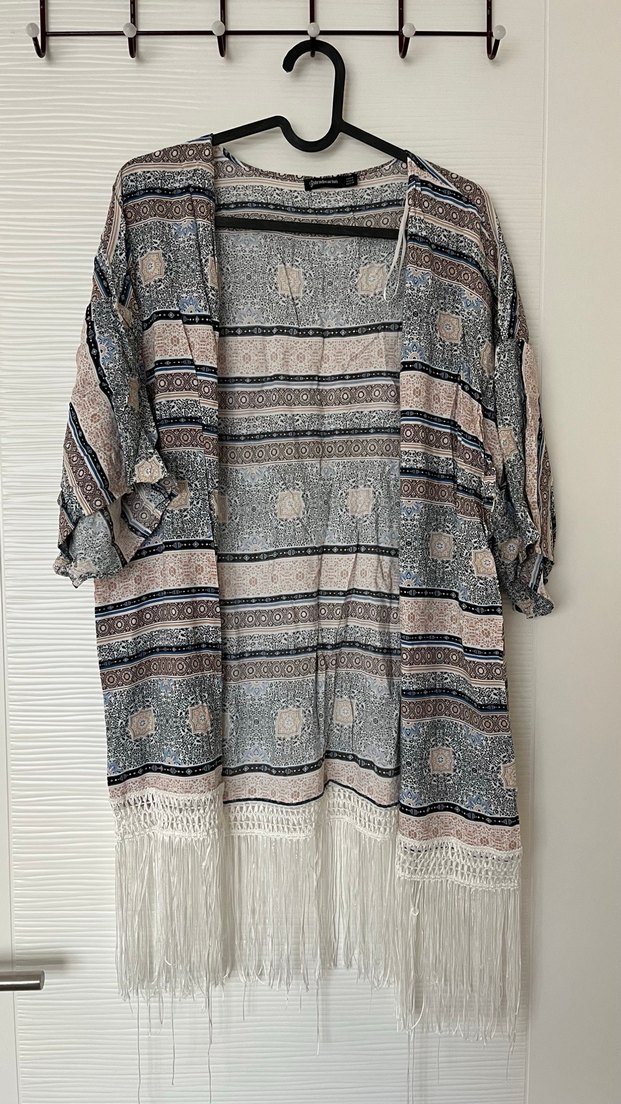 Uzun, bol kesim bohem kimono, püskül detaylı etek ucu ve bağlama desenli tasarımıyla. Uzun kollu, kayık yaka, bej ve gri tonlarında retro tarzda.