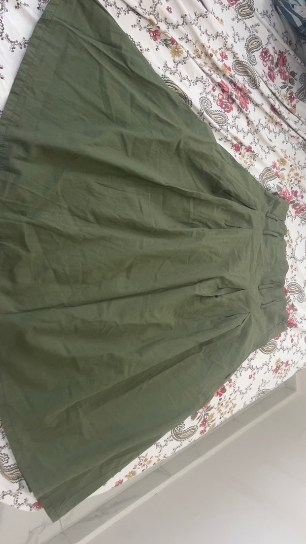 Haki renkte, sentetik kumaştan uzun ve salaş kesim etek. Drapeli tasarımıyla vintage bohem tarzını yansıtır, açık hava kullanımı için uygundur.