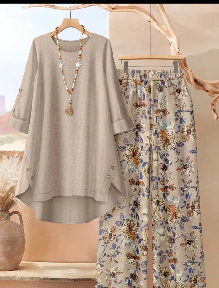 Bol kesim, uzun saten elbise, drapeli tasarım, uzun kollu ve bisiklet yaka. Bej renkli, çiçek desenli pantolonlu bohem tarzda.