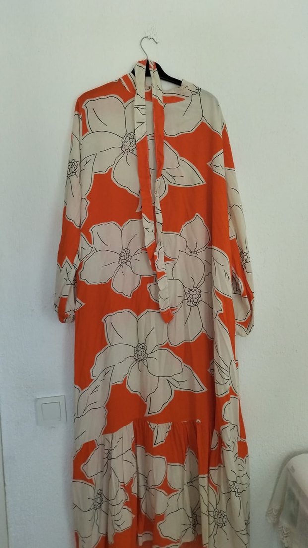 Büyük çiçek desenli, turuncu uzun elbise. Drapeli, bol kesim, halter yaka ve uzun kollu, yumuşak sentetik kumaştan yapılmıştır. Kemeri var isteğe göre kullanılır. 42-44 beden uyumlu