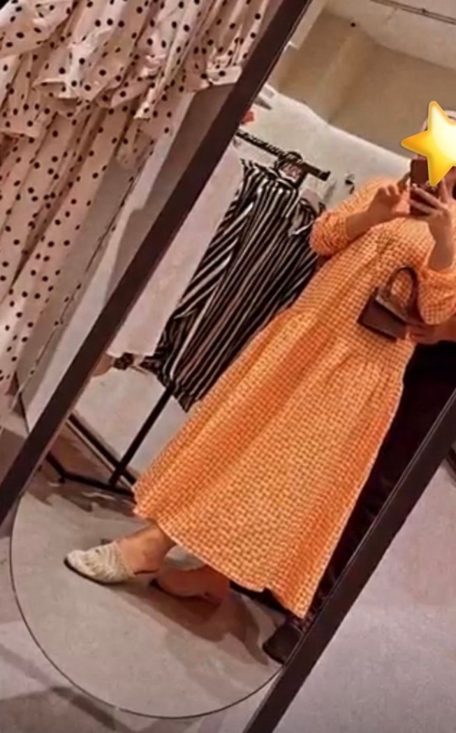 Yüksek yakalı, pilili ve bol kesim uzun elbise, yumuşak sentetik kumaştan pastel turuncu tie-dye desenlidir. Bohem ve vintage tarzına uygundur.