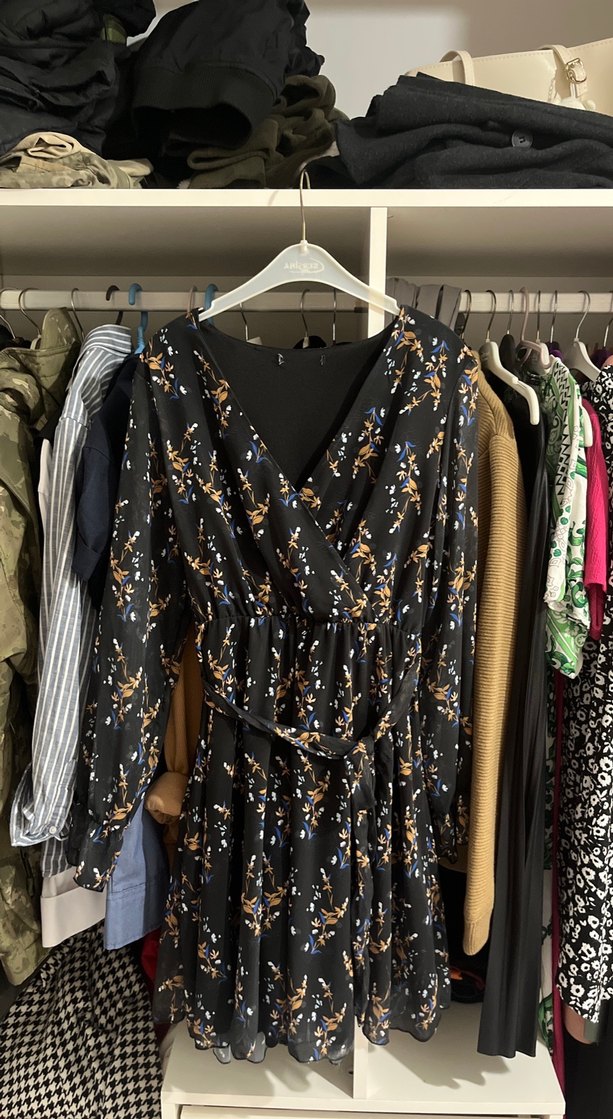 Drapeli, askılı kollu ve V yakalı bu uzun, bol kesim elbise kahverengi tonlarında desenli kumaştan yapılmıştır. Günlük kullanım için uygundur.