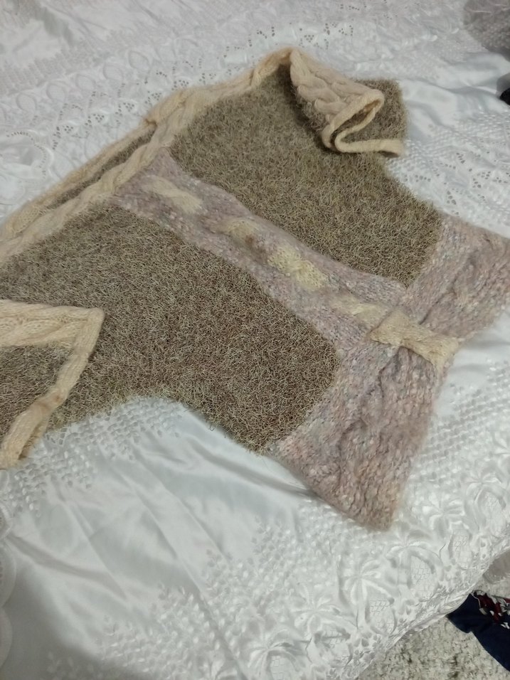 Bej renkli, bohem tarzda, örgü kumaştan yarım kollu kesim, yarasa kol kayık yaka el örgüsüdur sakallı ipten örülmüştür.iyi durumda.