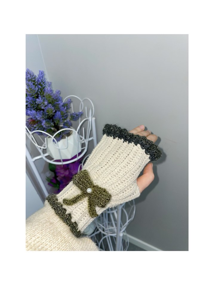 Yeşil kenar detaylı beyaz örgü, bohem tarzda kadın eldiveni. Parmaksız yapısıyla rahat ve retro, hippie havası verir.