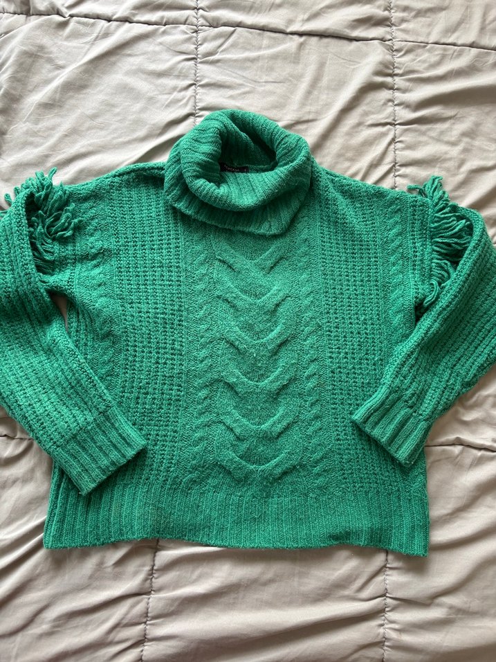 Bu yeşil triko kazak, boğazlı ve uzun kollu, bol kesimdir. Yumuşak ve sıcak dokusu günlük kullanıma uygundur, bohem tarzını yansıtır. S beden ama her bedene olur oversize