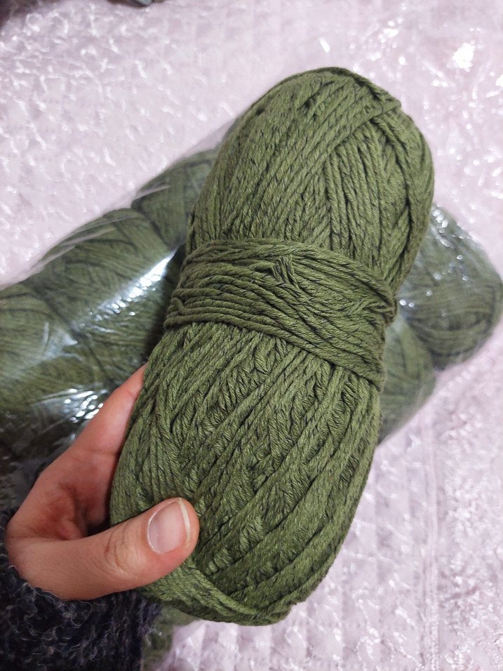 Zeytin yeşili tonunda, yumuşak dokulu bohem tarz el işi ipi.