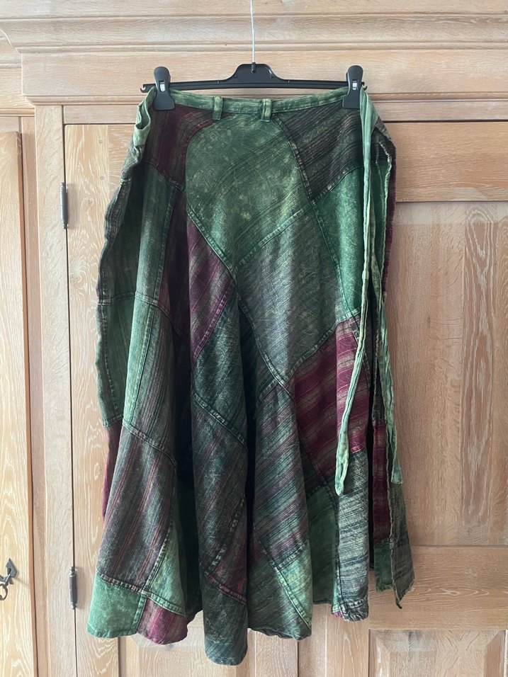 Bohem tarzda, koyu yeşil batik desenli, bağcıklı ve bol kesim uzun etek, günlük kullanım için uygundur. Hindistan ürünü bel uzunluk 125 santim boy 85 santim