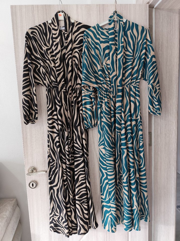Bohem tarzda, zebra desenli uzun elbiseler. V yaka, askılı kollu ve kemerli, bol kesim. Sentetik kumaştan, koyu mavi ve siyah renk seçenekleriyle. 38-40-42 bedene uyumlu bir elbise fiyatidir
