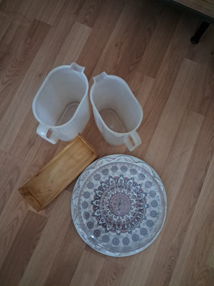 İki beyaz pürüzsüz sürahi, ahşap tepsi ve gri tonlarda bohem desenli yuvarlak tabaktan oluşan set. ️