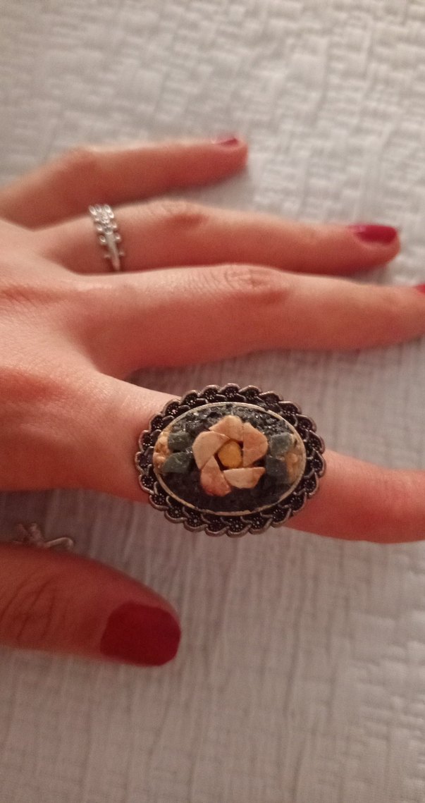el yapımı taş çiçekn desenli, kadın yüzüğü. Bohem, hipi ve retro tarzlara uyumlu, vintage havasında. Düğün için uygun.