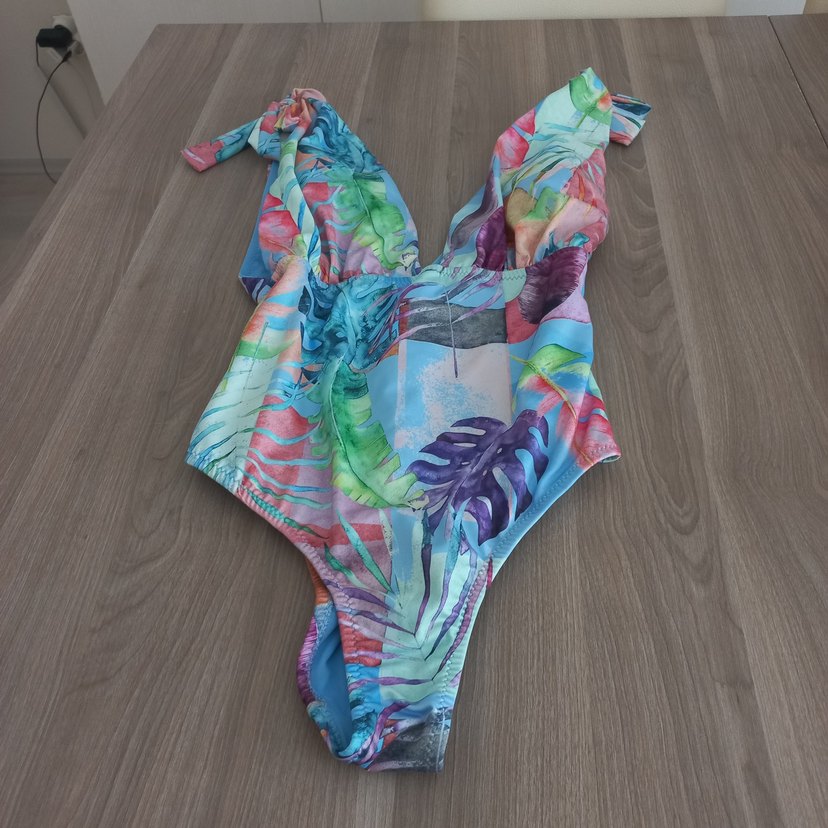 Drapeli tasarımı, ince askıları ve pastel tonlarda çok renkli tie-dye deseniyle bohem tarzda uzun kadın mayo.