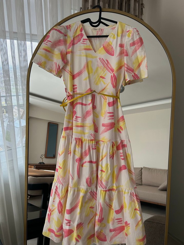Yumuşak sentetik kumaştan, bol kesim, V yaka ve drapeli, pastel tonlarda çok renkli batik desenli uzun elbise.