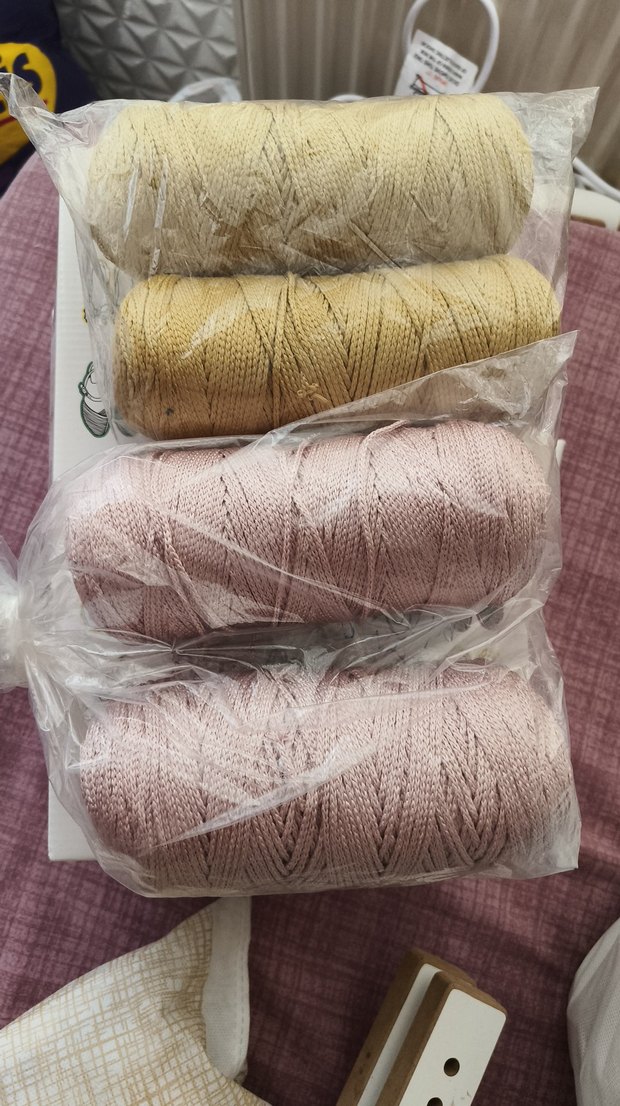 Bohem tarzda el işi için yumuşak, pastel sarı ve pembe tonlarında ip seti. Şeffaf poşet içinde paketlenmiştir.