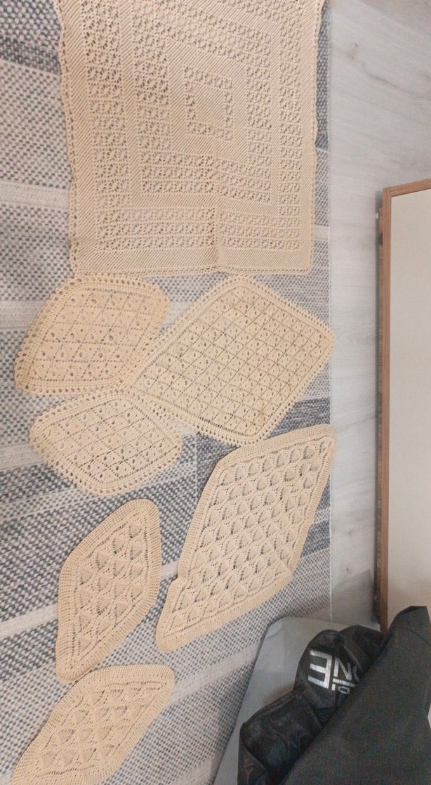 Bohem tarzda, el örgüsü detaylara sahip bej dekoratif örtüler. Doğal ve sanatsal bir hava katar. el emeği hiç kullanılmadı.