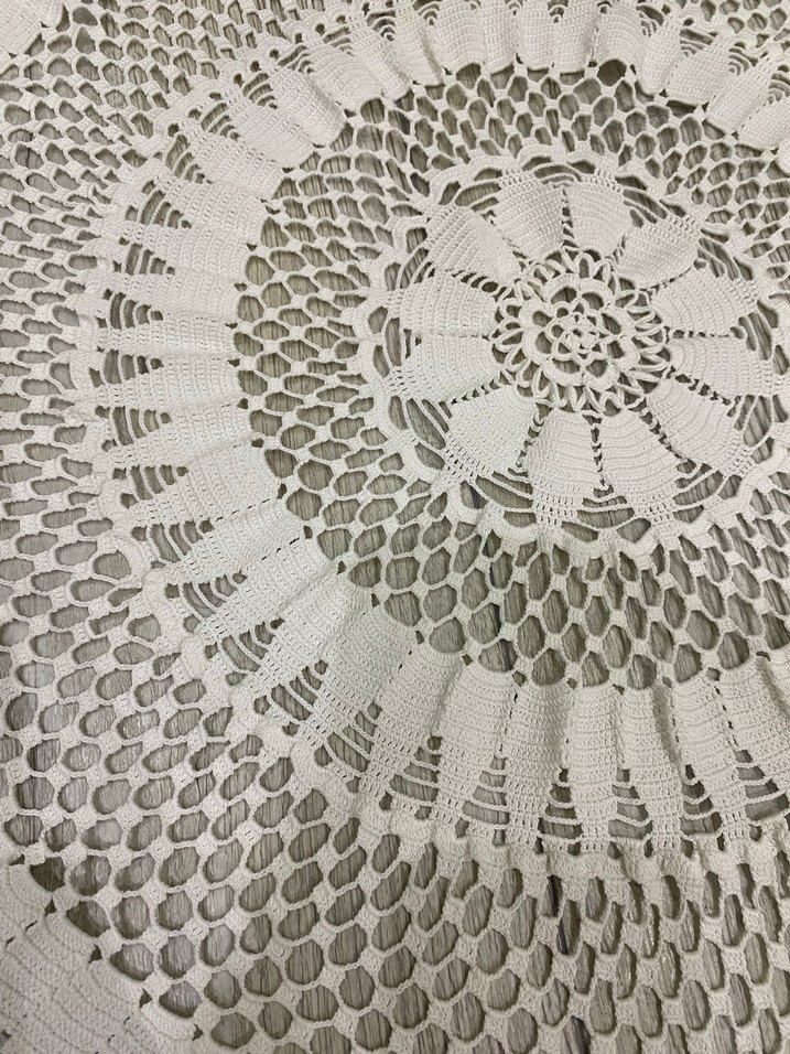 Bohem tarzda yuvarlak, el örgüsü dantel örtü, ince ve detaylı desenlere sahiptir.