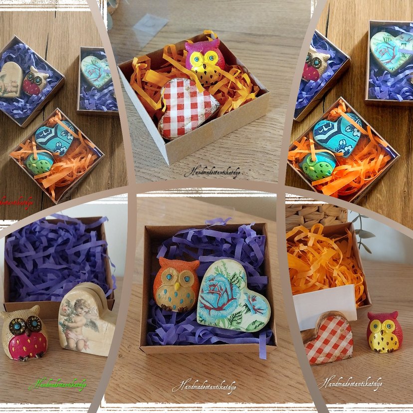 Bohem tarzda el yapımı, renkli baykuş ve desenli kalpten oluşan masa üstü kartvizitlik set, kutu içinde renkli kağıtlarla sunuluyor.