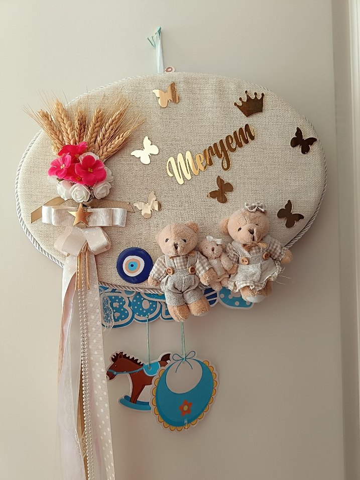 Bohem tarzda, Meryem isminin yer aldığı, ayıcıklar, kuru buğday, çiçekler ve ahşap kelebeklerle süslenmiş el yapımı kapı süsü. takı yastığı sıfırdır hiç kullanılmadı.kapi süsü iyi durumda sadece buğdaylardan bir iki tane düşmüş belirttim