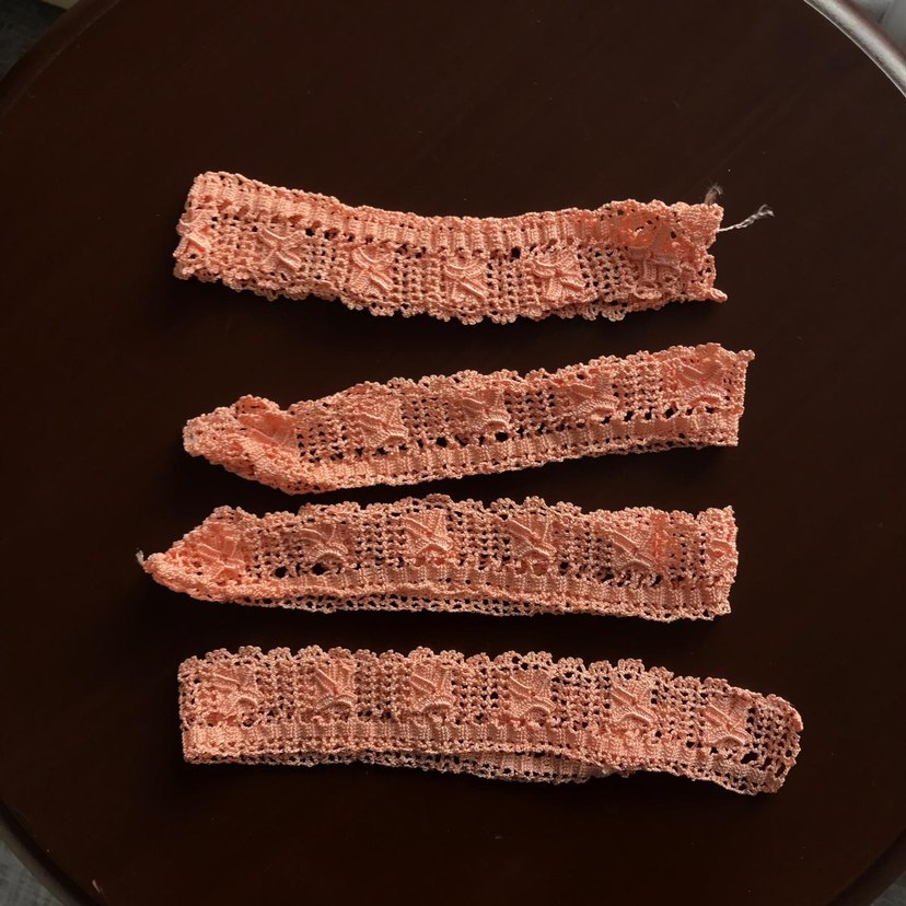 Bohem tarzda el yapımı, yumuşak pembe renkte, detaylı desenlere sahip dantel şeritler. El işi projeler ve süsleme için uygundur. 4 adettir havlu kenarı icindir