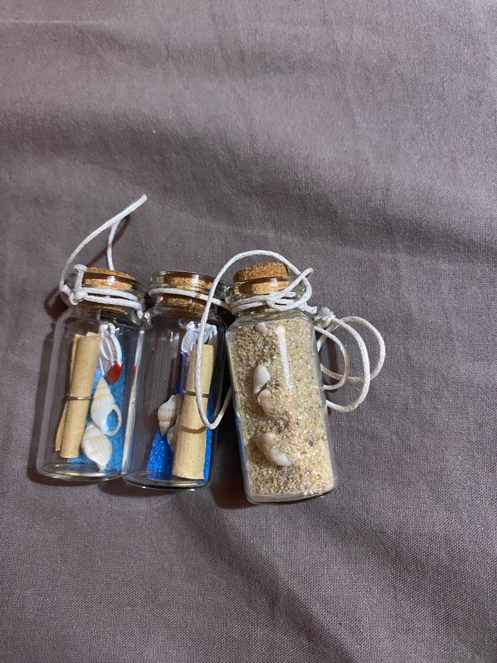 Küçük cam şişelerde kum, minik parşömenler ve deniz kabukları bulunan bohem tarzda el yapımı kolyeler. Beyaz ip ile kullanılır.