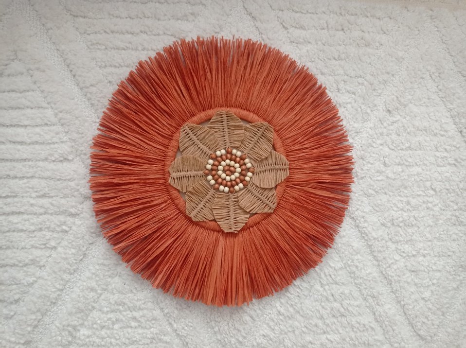 Turuncu püsküller ve boncuklarla süslenmiş örgü merkezli, yuvarlak bohem tarzı el yapımı duvar süsü. Mekâna doğal ve sanatsal bir hava katar.