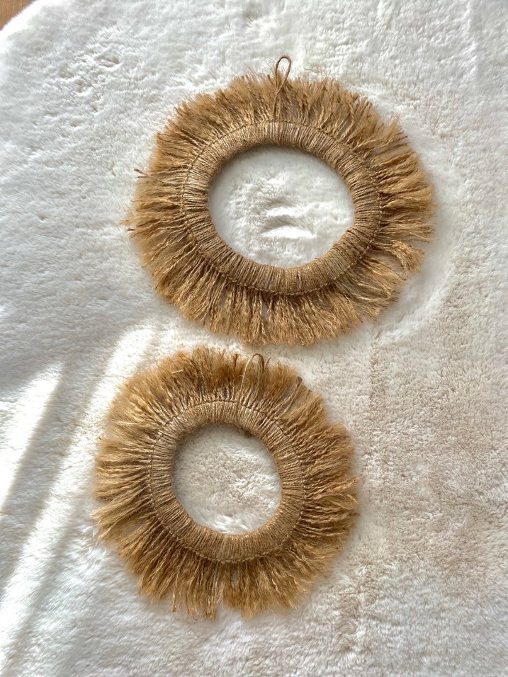 Doğal hasırdan yapılmış, püsküllü kenarlara sahip iki adet bohem tarz el yapımı duvar süsü. İç mekanlara rustik bir hava katar.