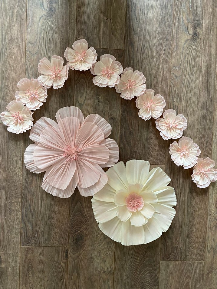 Yumuşak pastel tonlarda, bohem tarzda el yapımı kağıt çiçekler. Dekoratif kullanım için uygundur.Doğum günü,hastane odası,organizasyon vb. yerler için arka fon istenilen renk ve boyda yapılır