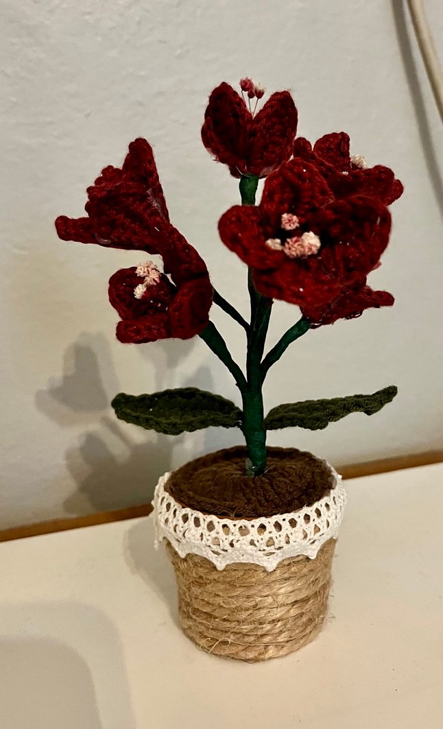 Doğal iplikle sarılı saksıda kırmızı tığ işi çiçekler ve yeşil yapraklar bulunan bohem tarzda el yapımı dekoratif ürün.