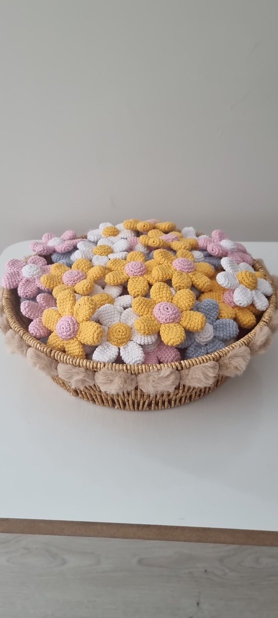 Bohem tarzda, pastel tonlarda el yapımı örgü çiçek anahtarlık.