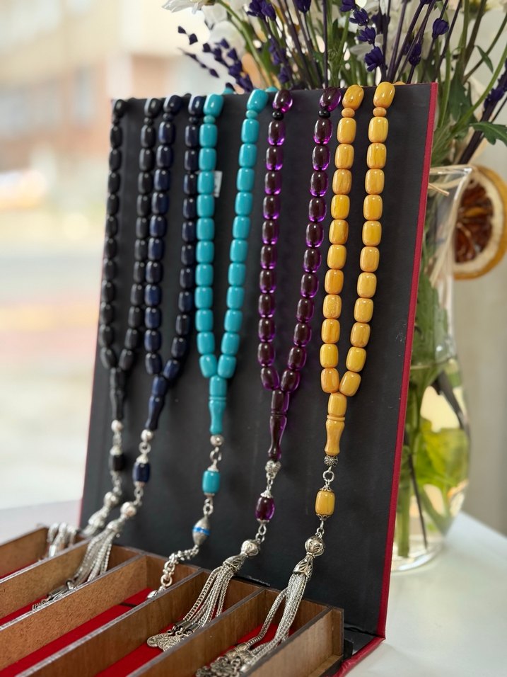 Bohem tarzda, siyah, mavi, turkuaz, mor ve sarı renklerde canlı erkek tesbihleri. Her biri düzgün boncuklar ve süslü püsküller içerir.