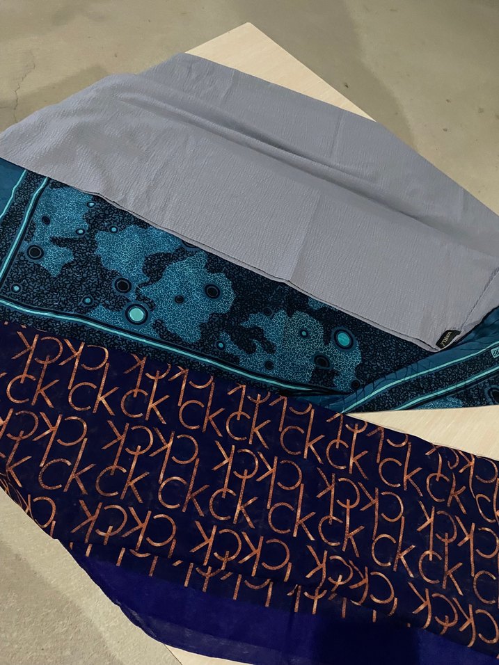 Gri ve mavi renklerin harmanlandığı, dökümlü tasarımlı kadın eşarp. Yumuşak sentetik kumaştan, rahat ve bohem tarzda bir görünüm sunar.