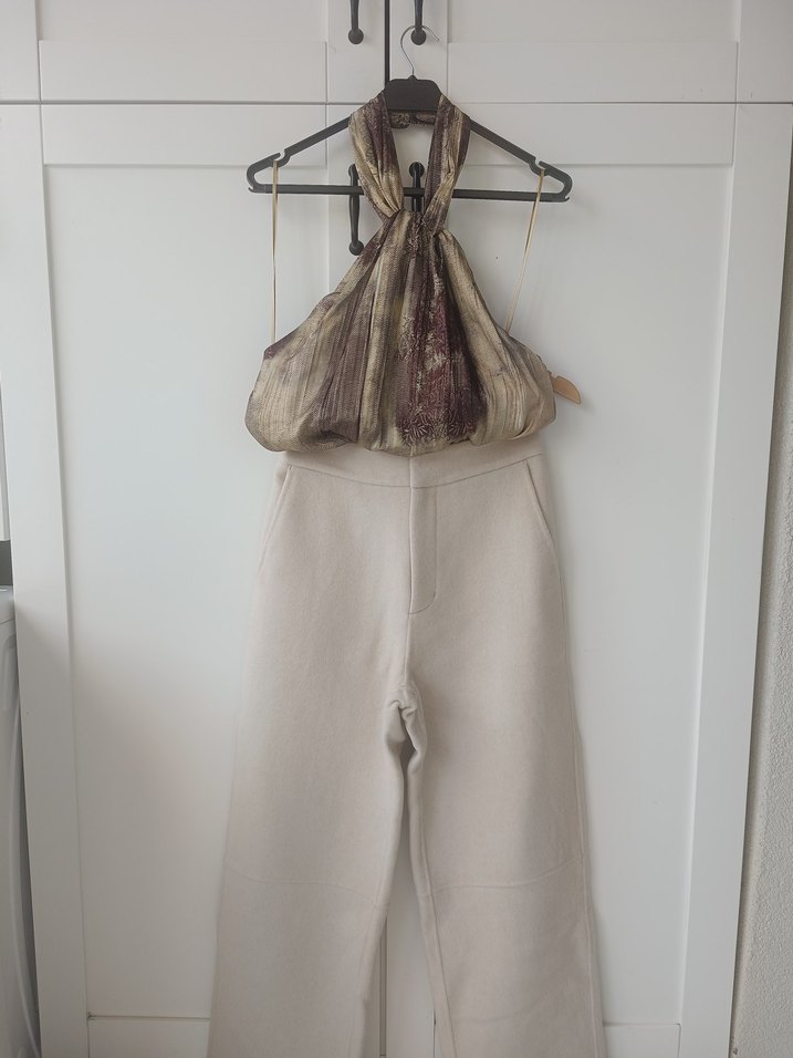 Yumuşak yün malzeme kumaştan, bol kesim ve midi boyda kadın pantolonu. Bej renkte, drapeli tarzda, günlük kullanıma uygun.