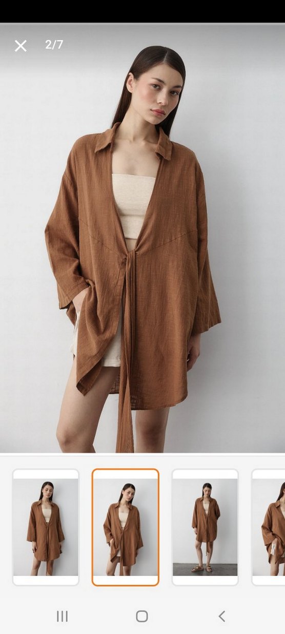Uzun kollu, bol kesim, açık bej renkte, bohem ve minimalist tarzda midi sabahlık. Belinde bağlama detayı bulunur.